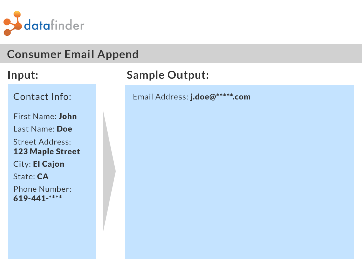 Use the Datafinder API to programmatically append email addresses to your customer or prospect list. Both our Email and Phone APIs will also return a First and Last name and Postal Address.