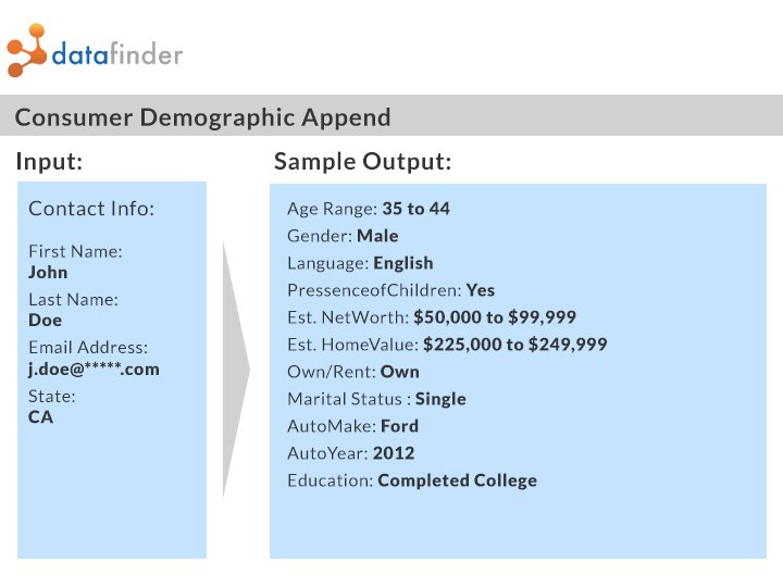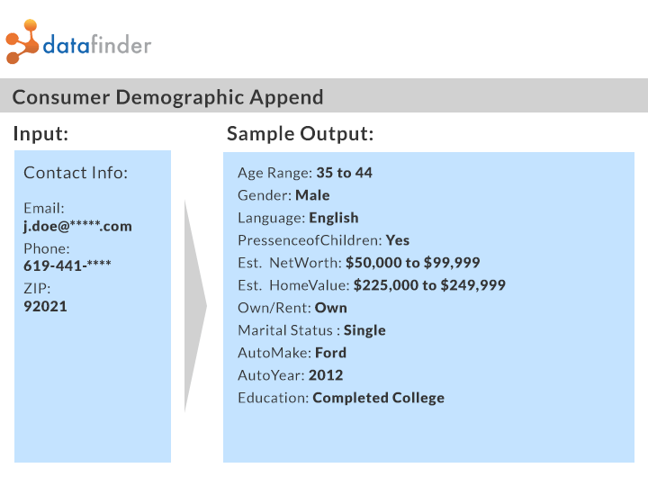 Datafinder's Consumer Lifestyle and Interests Append API service allows you to input basic contact information from your CRM and append LifeData® to your customer or prospect list. Gain insight into your customer's interests, activies, purchase behavior and much more.