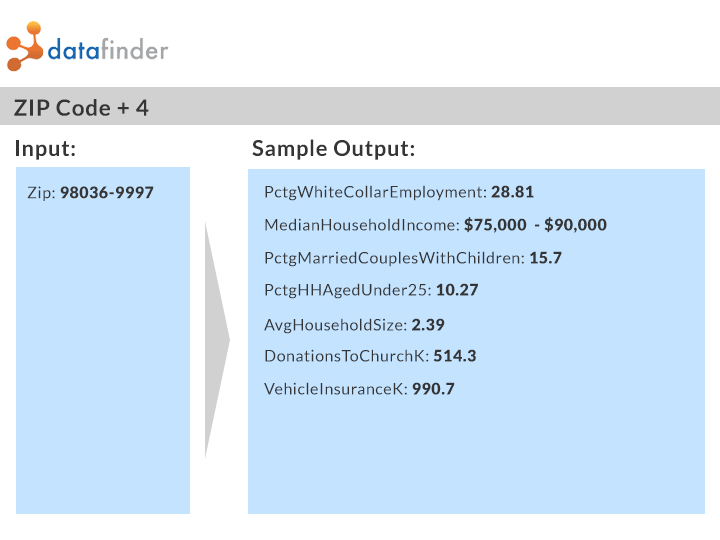 Append extensive demographic data to any ZIP+4 in the United States with LifeData® using Datafinder’s ZIP+4 Demographic Append API. With over 44 million ZIP+4 codes in the US, a ZIP+4 represents as few as 8 people. This level of granularity, covering the entire US, provides valuable insight into any US geolocation.